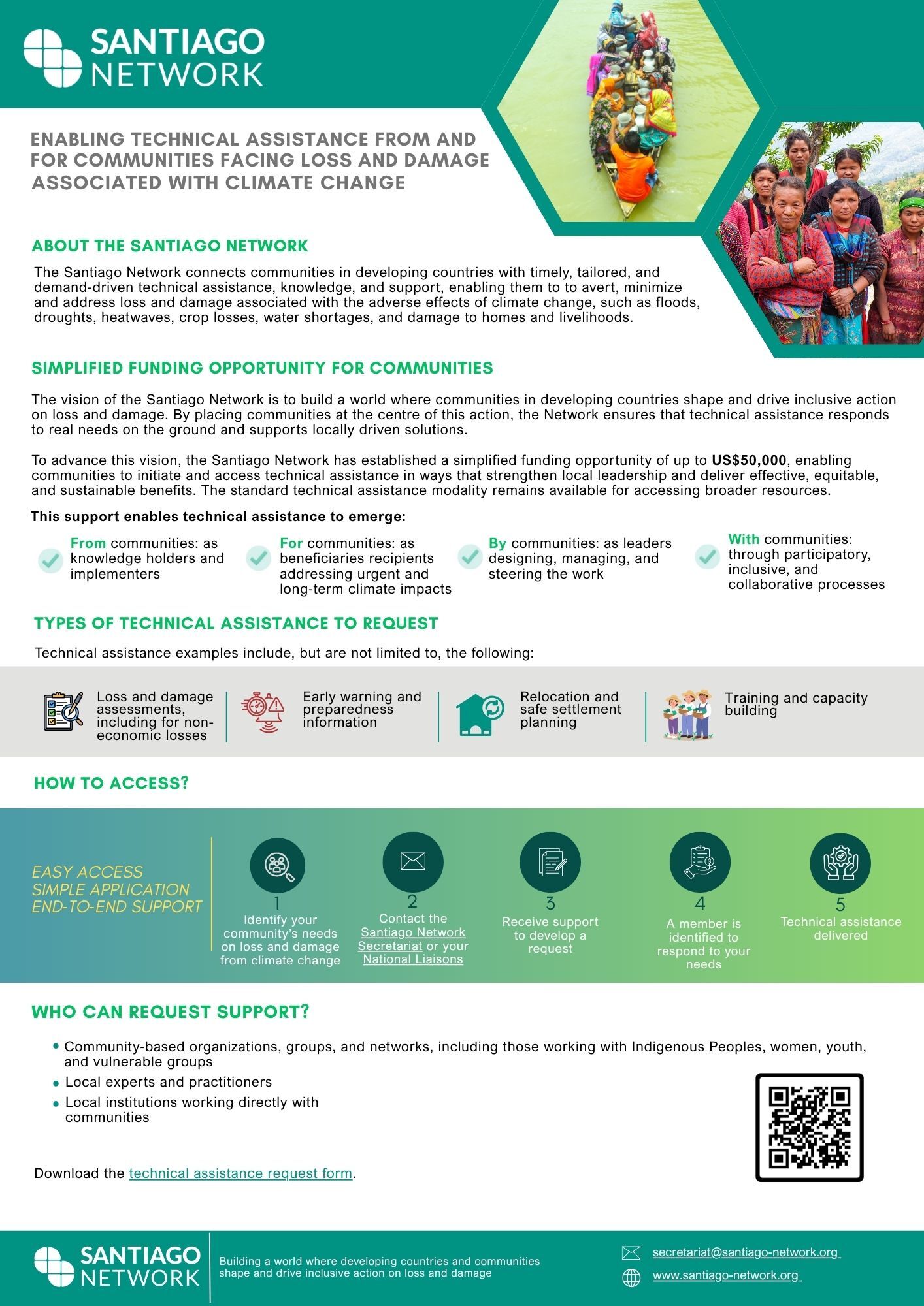 By enabling communities to initiate and shape technical assistance through a simplified process, the Santiago Network helps strengthen local leadership, improve access to expertise and resources, and foster solutions grounded in local realities. Communities seeking support should: (i) identify community needs related to climate loss and damage; (ii) contact the Santiago Network Secretariat or National Liaisons; and (iii) receive support from the Santiago Network Secretariat to develop a request. Following review, the Santiago Network will identify a Member to deliver the required technical assistance. Throughout this process, the Santiago Network Secretariat provides end‑to‑end support, including guidance on procedures, assistance with documentation, and verification to ensure requests are properly submitted.